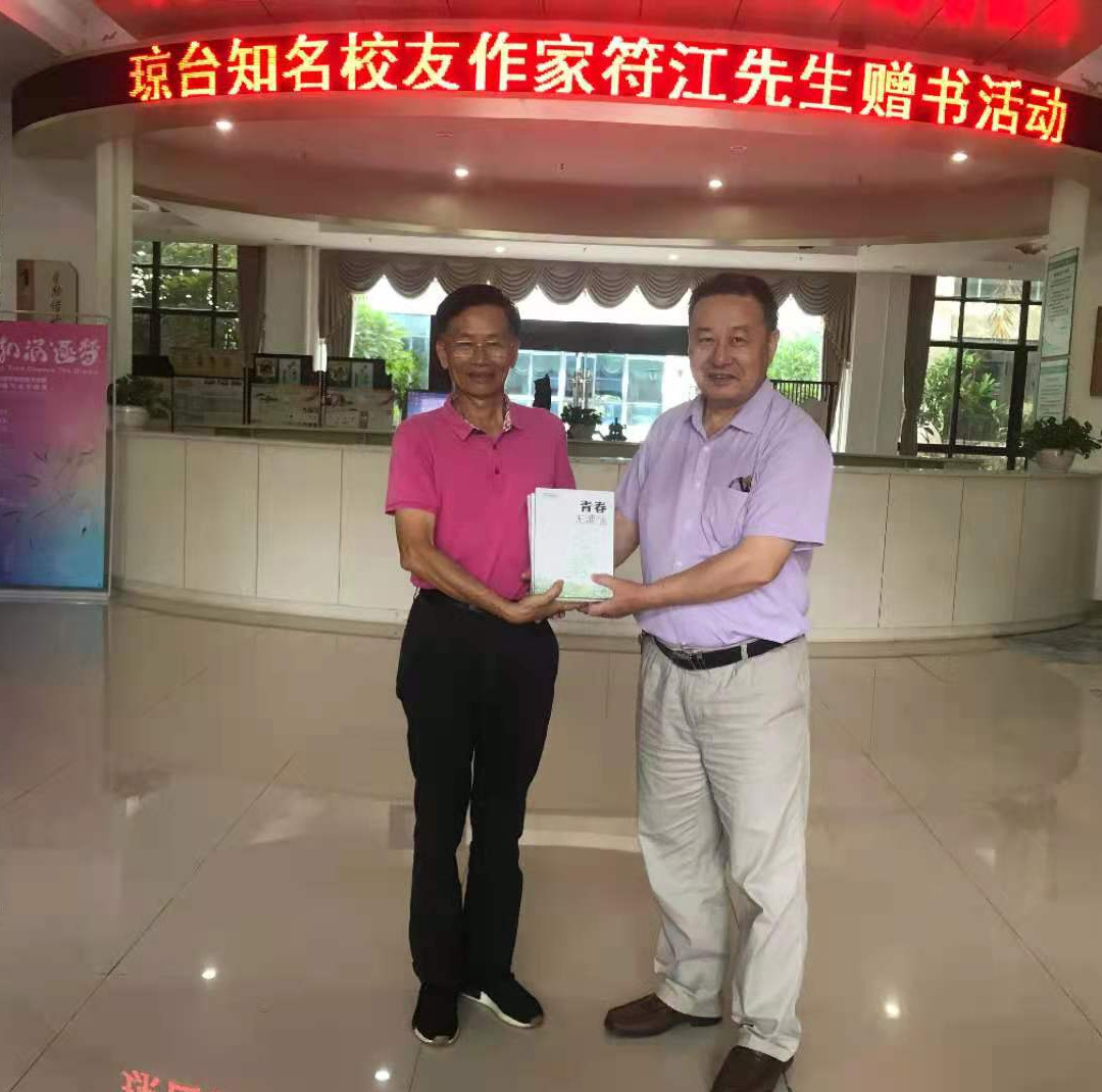 六月二十二日上午,我校知名校友、作家符江向我馆赠书。馆长龙文希教授接受赠书。