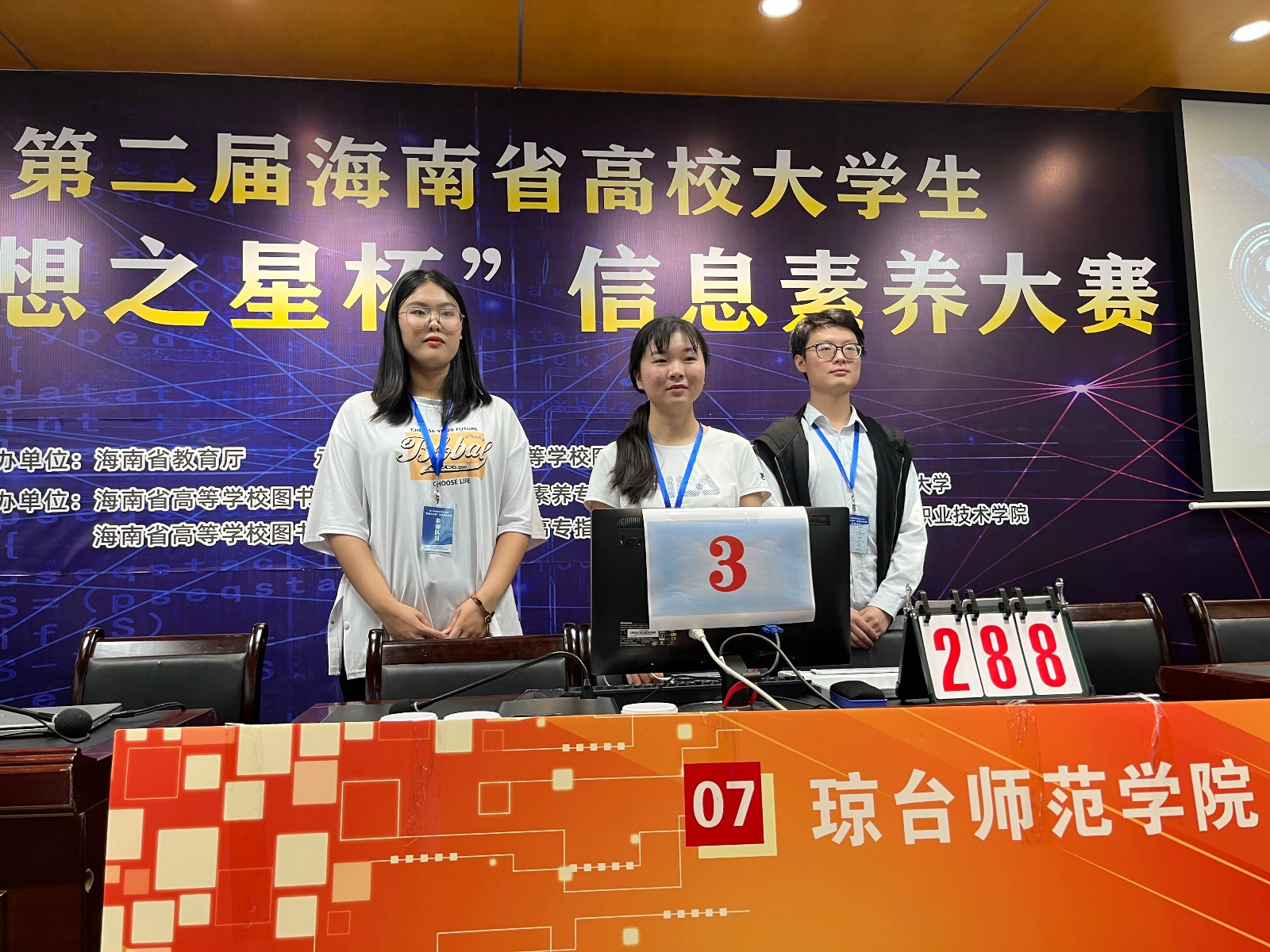 总决赛赛程紧凑、内容丰富、比赛规则创新复杂,我校2020数学与应用数学1班丁程心、2020学前教育1班的侯磊和林金茹三位同学在比赛中默契配合、冷静应对,力挽狂澜,最终获得本科组总分第二名,全省二等奖的成绩,与海南大学共同获得了中南六省区信息素养大赛选拔赛的参赛资格。图书馆谢硕研、吴海春获得“优秀指导老师奖”;图书馆谢硕研、吴海春、黄敏获得“优秀指导案例奖”。