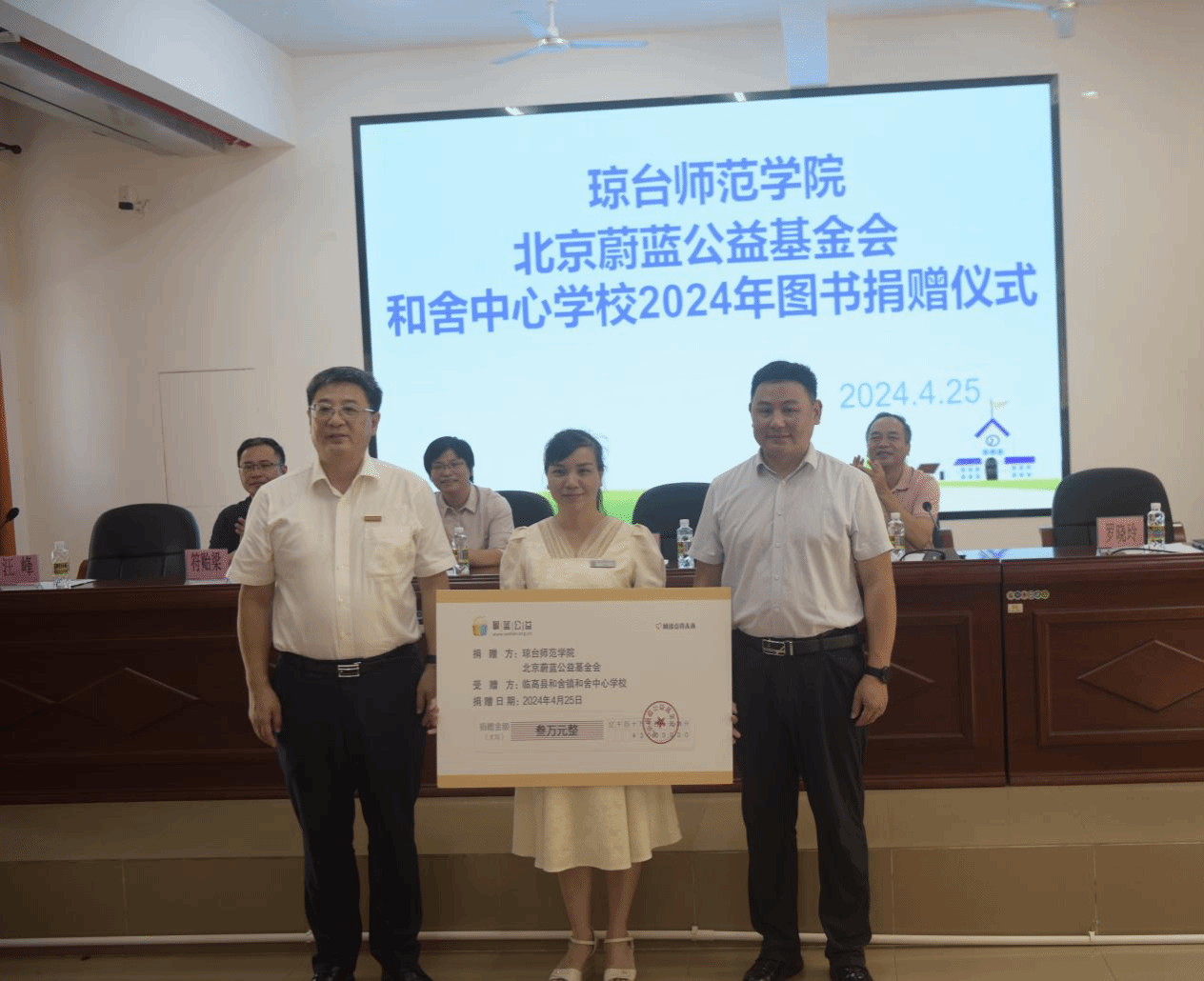 4月25日,学校党委委员、副校长王安兴率队赴临高县和舍镇中心学校开展助力乡村振兴图书捐赠暨走访慰问活动,并与和舍镇党委书记陈慧、和舍中心学校校长罗晓玲就加强驻村帮扶工作,助力乡村教育进行了深入交流。学校图书馆馆长符方健、学校派驻和舍镇驻村“第一书记”符贻梁、北京蔚蓝公益基金会巡视员汪峰参加活动。